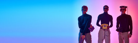 multicultural male models with landline phones surrounded by neon lights, men power, banner