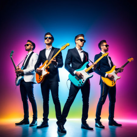Four Stylish Men Playing Electric Guitars on Colorful Stage