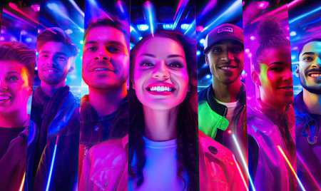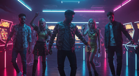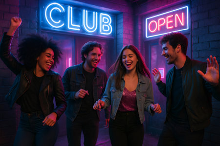 Friends gather in a lively downtown venue, dancing under vibrant neon lights. The atmosphere is electric with music, laughter, and colorful visuals creating an unforgettable night.