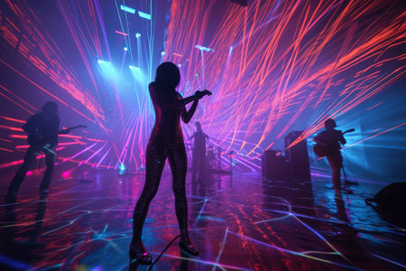 A lively concert scene with a large crowd of people enjoying the performance. The stage is illuminated with vibrant laser lights in various colors, creating a dynamic and energetic atmosphere.