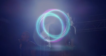 Performing two musicians using microphone and headphones on dark stage, with neon circle lighting. Concert, live music, nightlife, stagecraft, ambiance, performance, entertainment