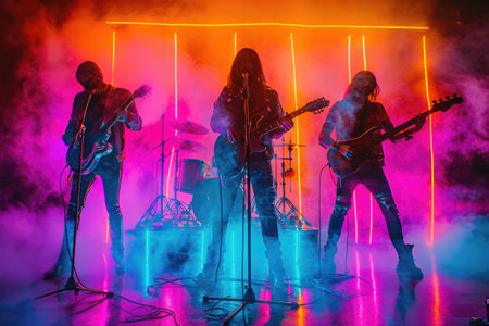 Rock band performing live on stage under dramatic lighting in a vibrant atmosphere
