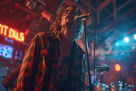 A male vocalist with long hair and plaid shirt performs on stage at a music club with retro 1980s style and colorful lights.