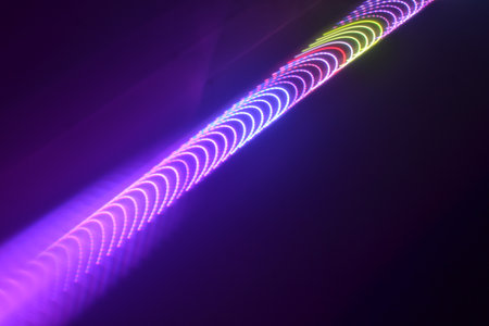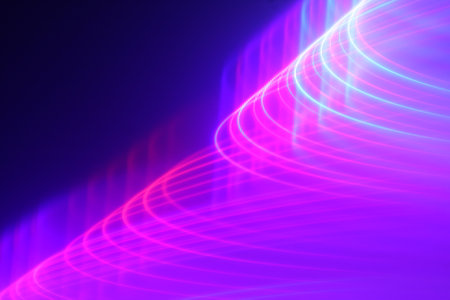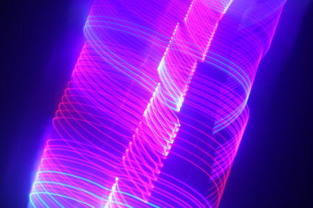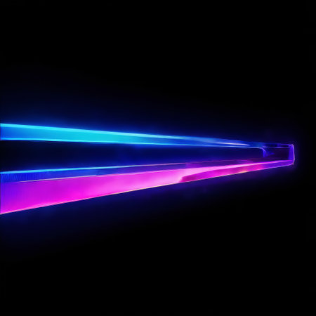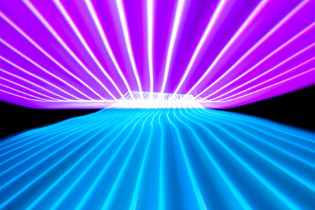 An abstract illustration presents streams of neon light in pink, blue, and green hues. The beams appear to emanate from a central point, set against a black environment. The composition utilizes vibrant colors and dynamic lines, possibly for visual effects or conceptual designs, applicable for digital media and creative projects.