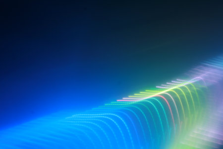 A abstract pattern resembling sound waves or liquid ripples, rendered in vibrant neon blue, green, and pink, glows on a dark, reflective surface.