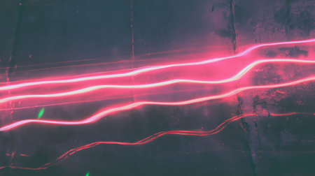 A vibrant red neon light forms a stylized pulse or cardiogram shape against a dark, textured concrete wall. The rough, cracked surface of the wall provides a stark contrast to the smooth, glowing neon. The light emanates a strong, energetic glow, creating a dramatic and modern aesthetic. combines of technology, science, and abstract