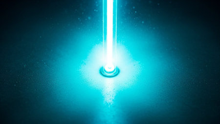 Vertical beams of bright blue light shine down onto a dark, reflective surface, creating a dramatic and futuristic industrial scene.