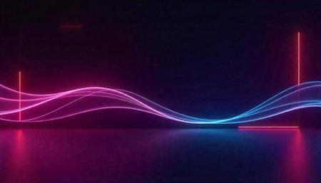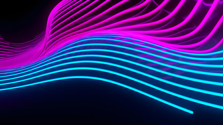 An abstract digital illustration showcases a flowing wave design, rendered in vibrant neon colors against a dark backdrop. The composition features dynamic lines and curves, creating a sense of movement and energy. Suitable for use in various visual communications, the design offers potential applications in modern design and technological projects.