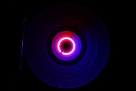 Music DJ concept. Trail of fire and smoke on vinyl record. Vinyl disk. Turntable vinyl record player on dark background. selective focus