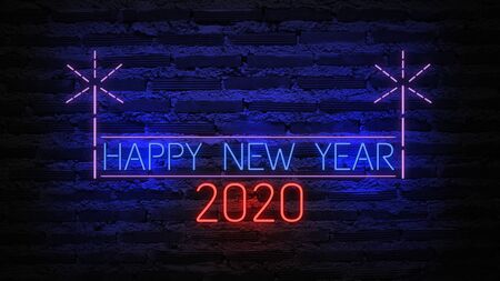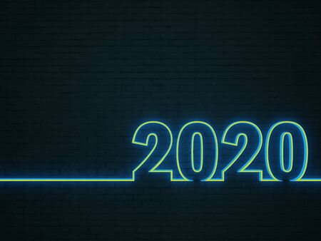 2020 neon sign background new year concept. Happy New Year. Brick background. Modern ultraviolet blue purple neon light. Flicker light. 3d illustration