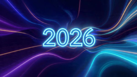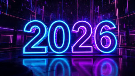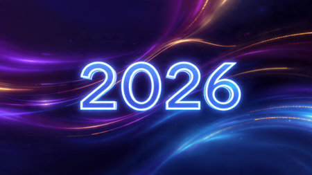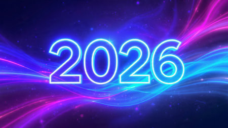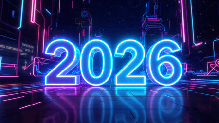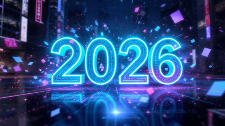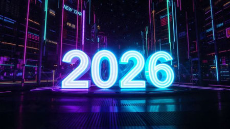 The year 2026 written in glowing blue neon light painting against a city skyline. Clear details a...