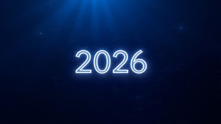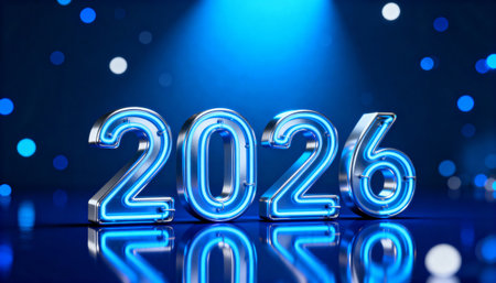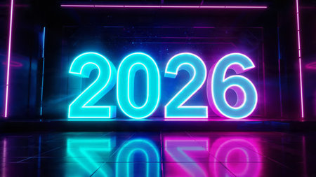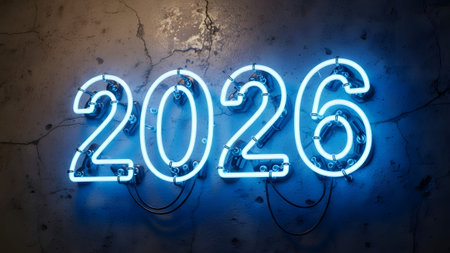 Bright blue neon numbers 2026 glow against a dark concrete wall Clear details and vibrant colors ...