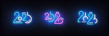2020 New Year neon set. Glowing 2020 Happy New Year typography sign.