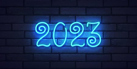 2023 New Year neon background colorful. Merry Christmas neon sign. Logo, emblem, banner and label, bright signboard, light banner