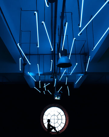 Interior of modern office building with blue ceiling lights. Abstract background.