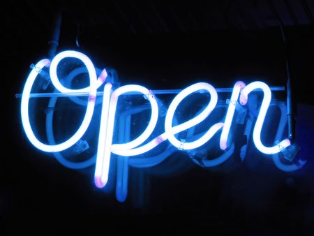 A blue neon GAME ON sign leading to the hallway at a gaming expo