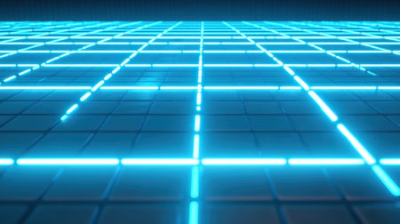 This stunning futuristic neon grid features bright blue lines against a dark backdrop, creating a captivating atmosphere ideal for technology-themed projects.
