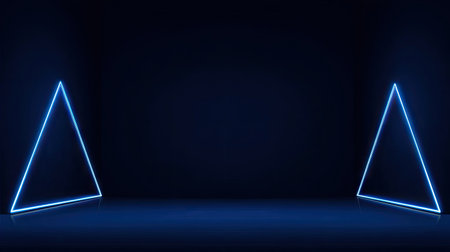 Dark setting with two glowing neon triangle shapes. The triangles are outlined in a vibrant blue light and are positioned in a corner. A dark reflective floor adds to the effect.