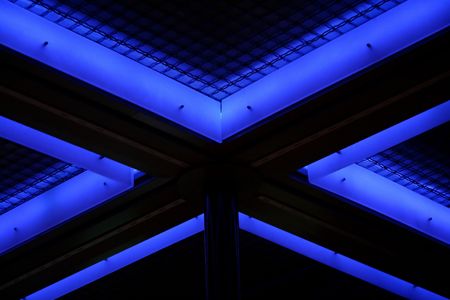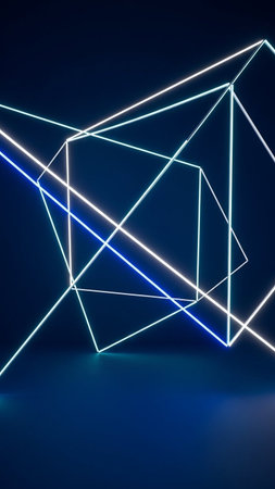 This image features a dark background with intersecting neon lights forming geometric patterns. The lights are arranged in a grid-like structure, creating a futuristic and abstract visual effect.