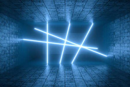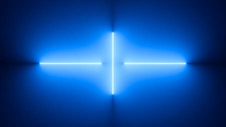 3d render, abstract blue neon background with glowing lines. Dark wall illuminated with luminescent lamps. simple wallpaper