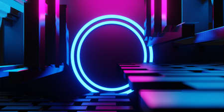 Neon circle in dark room. Futuristic concept. 3D Rendering