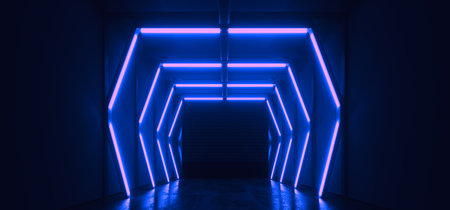 Abstract neon background blue purple neon. Modern design, trend interior, ultraviolet light, nightclub, luminous panels, stage decorations, corridor, tunnel. 3d render 3d illustration copy space