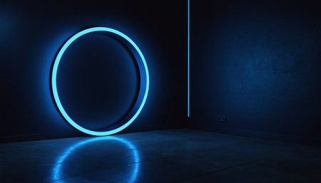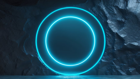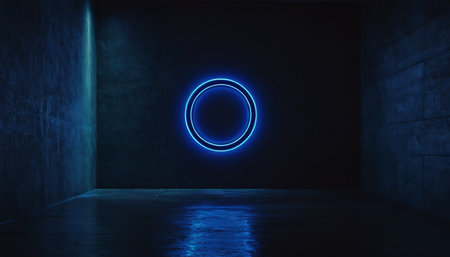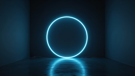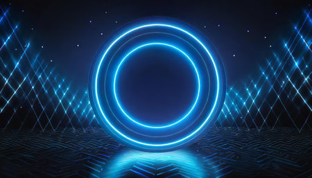 A vibrant neon blue geometric circle radiates a futuristic glow against a dark background, blending minimalism with cutting-edge design. Ideal for tech-inspired graphics, presentations, or