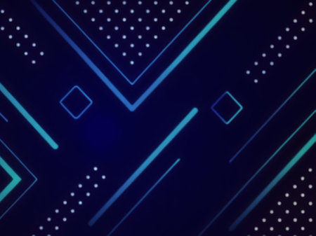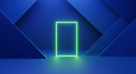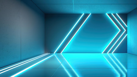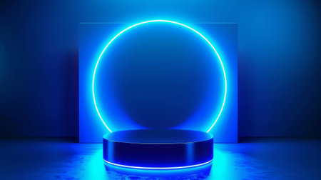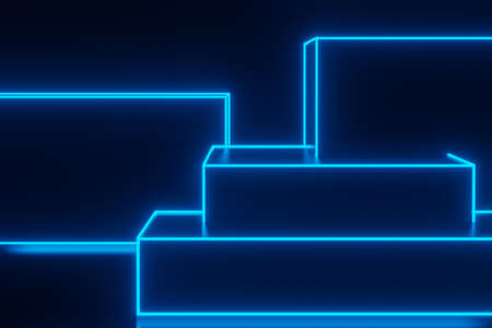 An abstract geometric showcase scene with neon light glowing on blue background.