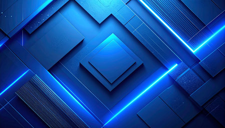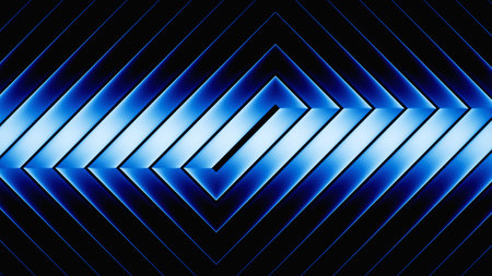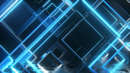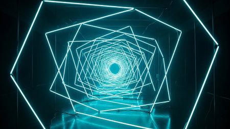 This image presents an abstract composition featuring bright, neon-blue light against a dark backdrop. The design employs geometric forms, creating a sense of depth and dimension. The overall style suggests a modern aesthetic, with potential applications in digital art, visual effects, or conceptual design for various media.