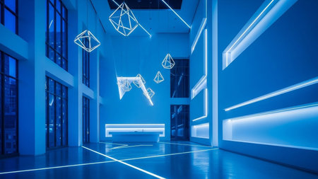 A spacious interior bathed in electric blue light with geometric light sculptures suspended from the ceiling and...