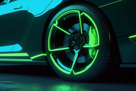 Future electric car with green LED lighting, wheels, tires and braking system. Generative AI
