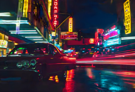 This image captures a vibrant urban nightscape, imbued with the kinetic energy of city life at night. A classic car, possibly from the 1960s, is in the foreground, bathed in the neon glow of street lights and illuminated signs. The background is a blur of motion, with streaks of light trailing from moving vehicles, suggesting the fast pace of the city. The reflections on the wet pavement enhance the feeling of dynamic movement. Neon signs and billboards add a vivid splash of color, contributing to the bustling atmosphere.