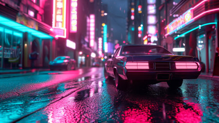 This stunning image showcases a futuristic synth-wave car gliding through the night, bathed in vivid purple neon lights. The dynamic lighting and retro-futuristic design immerse viewers in a