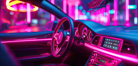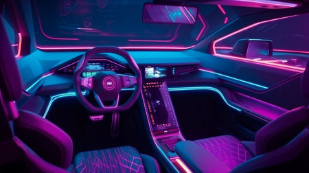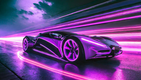 A sleek futuristic car adorned with neon lights driving through a city street at dusk, capturing the essence of advanced automotive technology and urban nightlife.