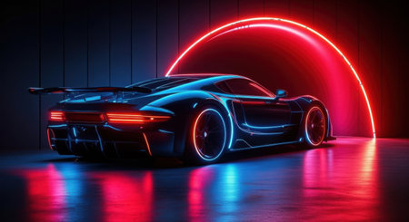 A futuristic black sports car with glowing red taillights is showcased against a vibrant neon archway, isolated on a white background.