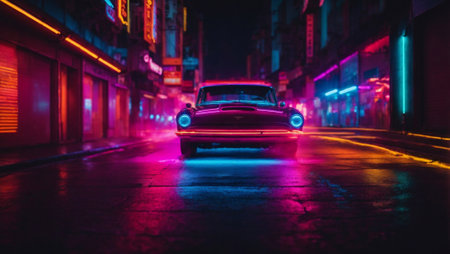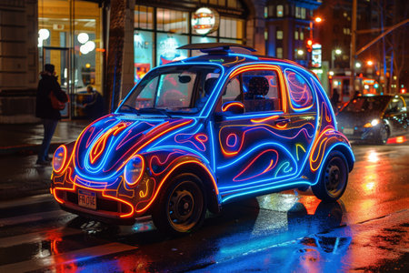A vibrant retro car adorned with neon lights parked on a city street at night, reflecting urban nightlife and creativity.