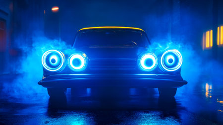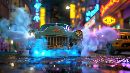 Classic antique vehicle emits blue vapor in dramatic city night setting, surrounded by neon reflections