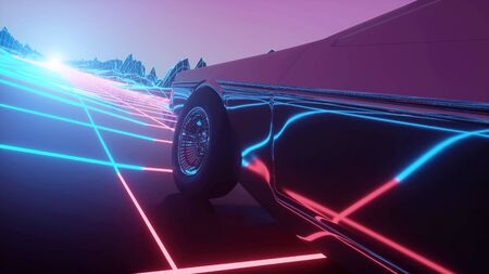 Retro futuristic car in 80s style moves on a virtual neon landscape. 3d illustration.