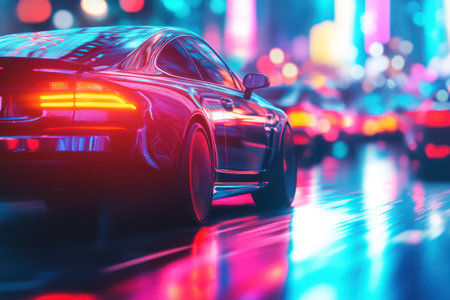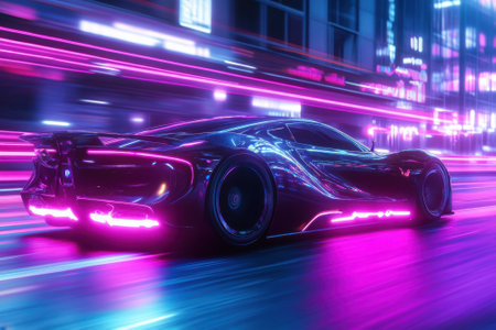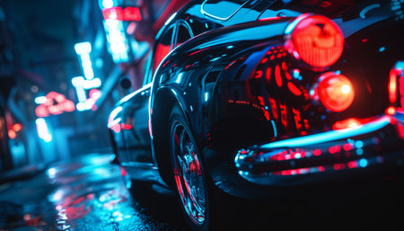 An exotic sports car's bold contours and glaming details are highlighted by the captivating interplay of neon lights, reflections, and blurred city scenery, creating a visually striking automotive