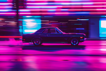 Dive into a retro-futuristic world with this stunning image of a car cruising through the night, illuminated by dazzling purple neon lights. Perfect for synth-wave enthusiasts and cyberpunk