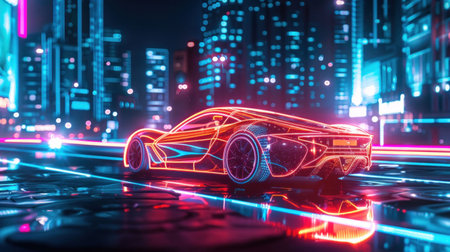 Neon lit futuristic sports car on a rainy city street at night, showcasing vibrant glowing outlines and reflections