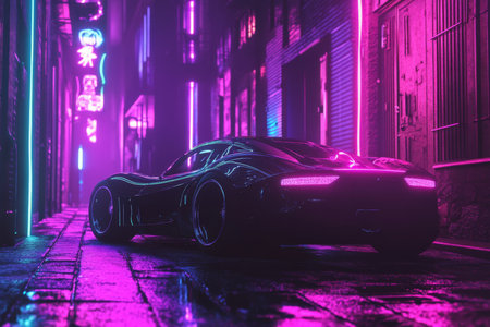 A sleek, black sports car parked in a dimly lit urban alley, surrounded by dark, neon purple and blue lights that outline its sharp contours. The neon lights reflect off the car_s glossy surface, crea.jpg