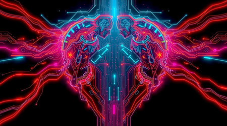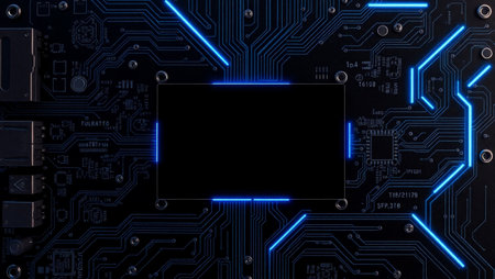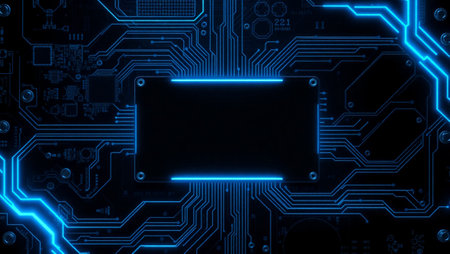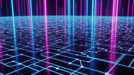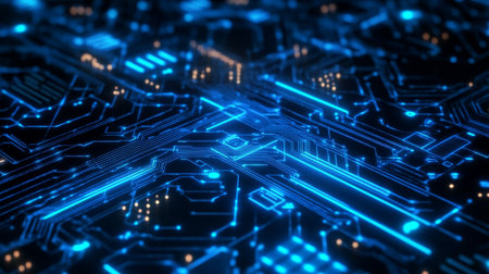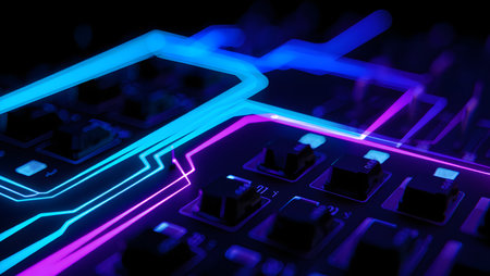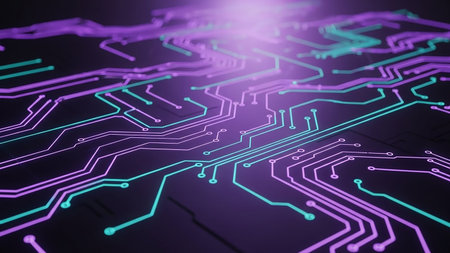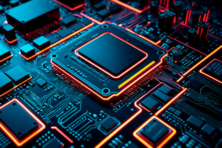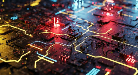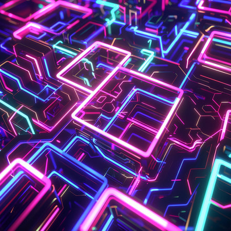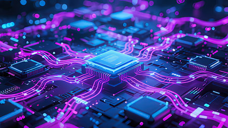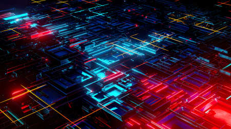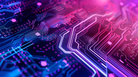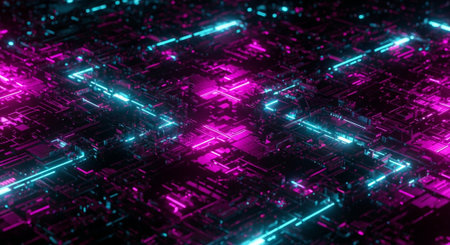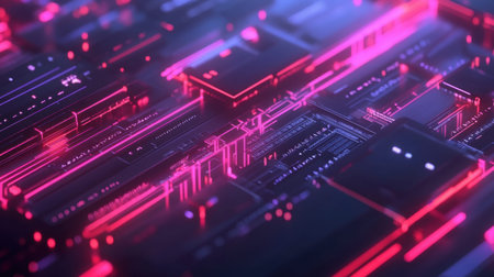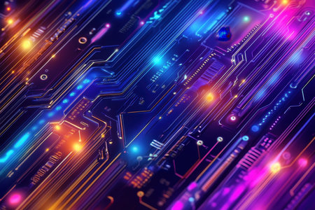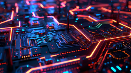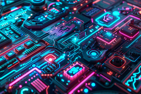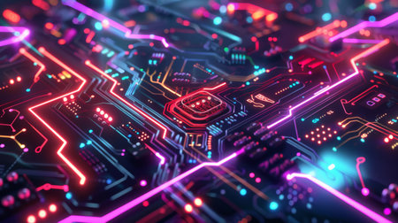 Vibrant neon-lit circuitry highlighting intricate pathways and components, creating a futuristic glow perfect for tech innovation and digital design t