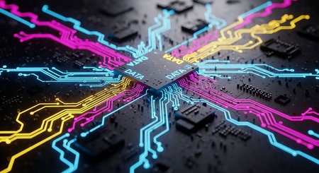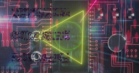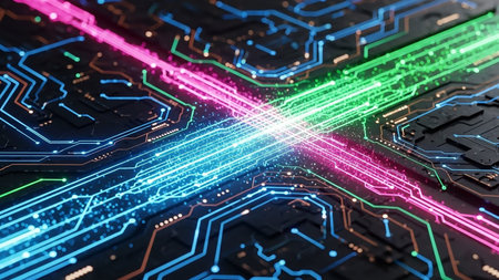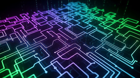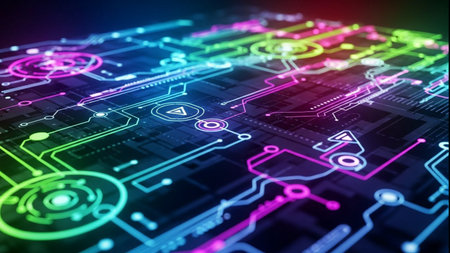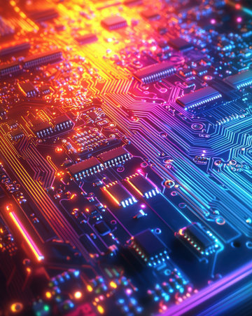 A closeup of a digital circuit board with vibrant neon colors and intricate pathways, showing advanced technology