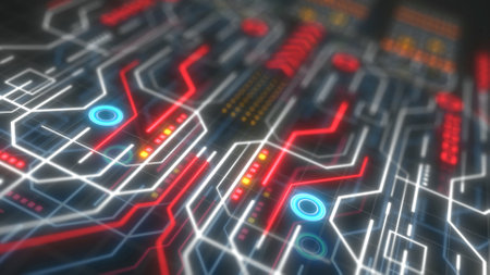 Close up of circuit board with red lights. Technology concept. 3D Rendering