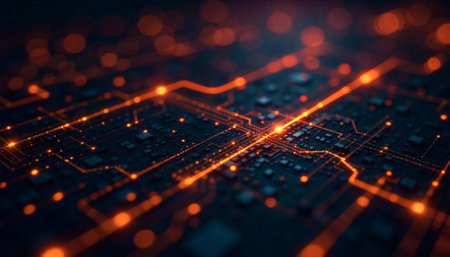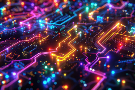 Vibrant lights illuminate intricate circuit patterns, showcasing a blend of technology and artistic design.
