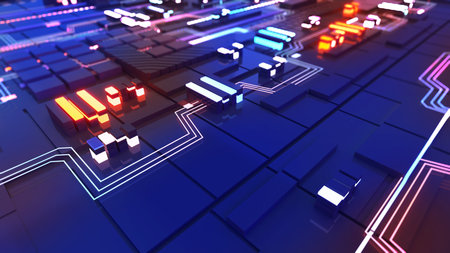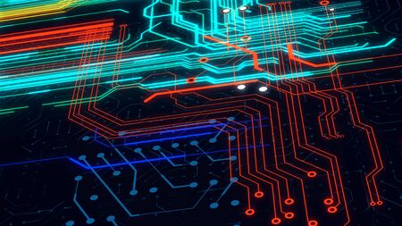 Circuit board futuristic server code processing. Orange, green, blue technology background with bokeh. 3d Illustration