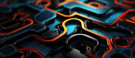 Holographic 3d illustration of a contemporary circuit board with orange, yellow and celeste crisscross stripes with spots in the black backdrop put aslant.