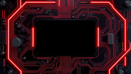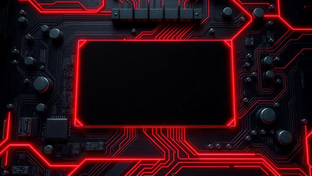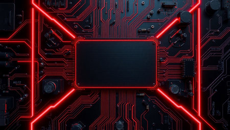 Close-up of electronic circuit board with glowing red neon lights. Technology concept