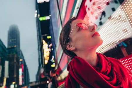 lighting on young asian woman in sunglasses looking at camera near red neon sign